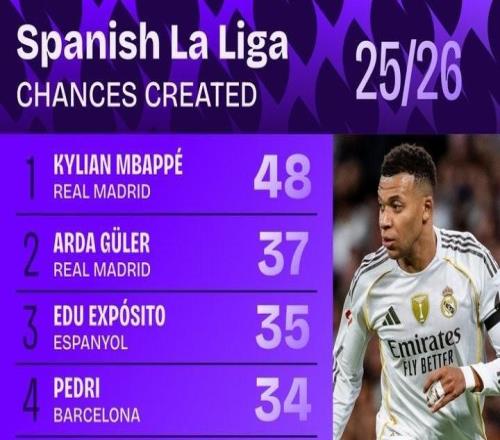 本赛季西甲创造机会榜:姆巴佩48次居首,居莱尔37次第二
